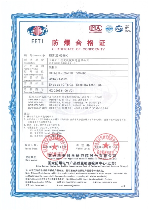 Gần đây, sản phẩm cốt lõi của Công ty TNHH Sản xuất Máy hậu cần Vô Tích Huiqian—băng tải con lăn—đã vượt qua thử nghiệm nghiêm ngặt một cách thành công và chính thức nhận được chứng chỉ chống cháy nổ EETI! Chứng nhận này biểu thị rằng hiệu suất chống cháy nổ của băng tải con lăn của Huiqian đáp ứng các tiêu chuẩn an toàn được quốc tế công nhận, cung cấp giải pháp xử lý vật liệu đáng tin cậy hơn cho các ngành có rủi ro cao như hóa dầu, khai thác than, dược phẩm và công nghiệp quân sự, đồng thời thể hiện năng lực kỹ thuật mạnh mẽ của công ty trong lĩnh vực thiết bị hậu cần chống cháy nổ.