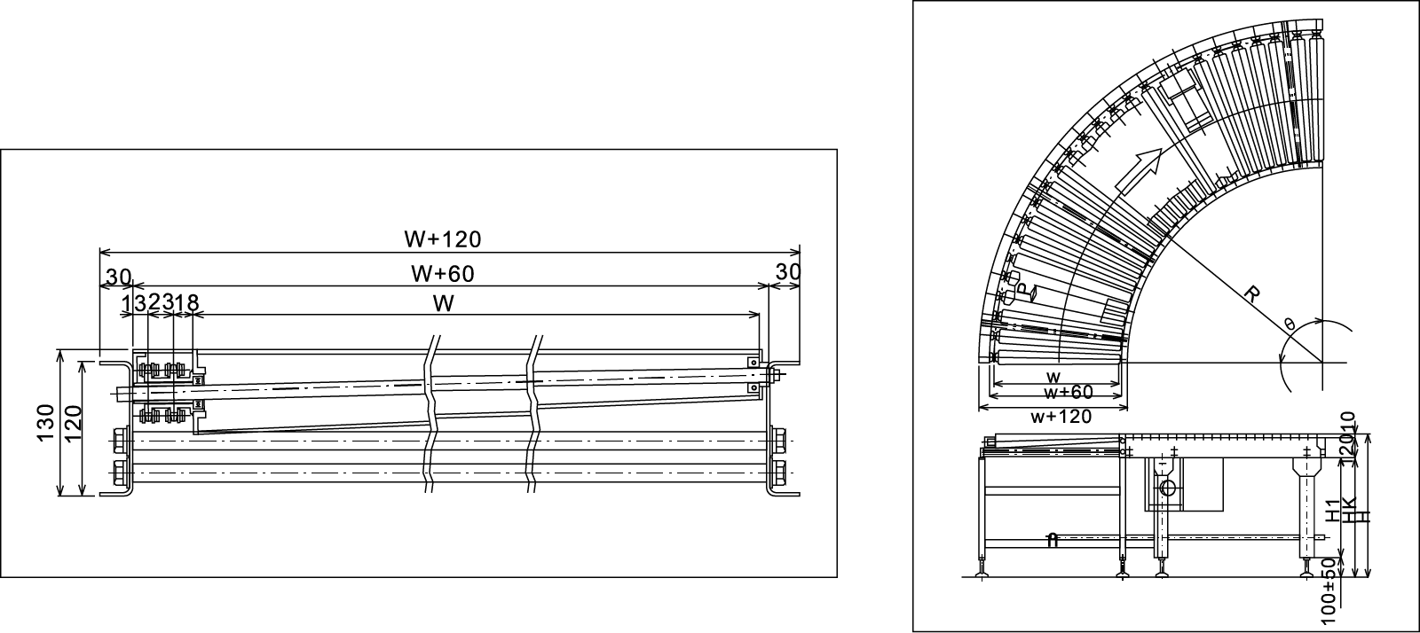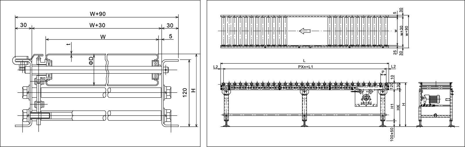 Băng tải con lăn điều khiển chuỗi là một băng tải lăn được cung cấp năng lượng chung. Nó được chia thành các loại bánh xích đơn và kép dựa trên cấu hình chuỗi. Băng tải chuỗi đơn phù hợp cho các con lăn dày đặc, trong khi băng tải chuỗi đôi được sử dụng rộng rãi và tổ chức theo chuỗi.